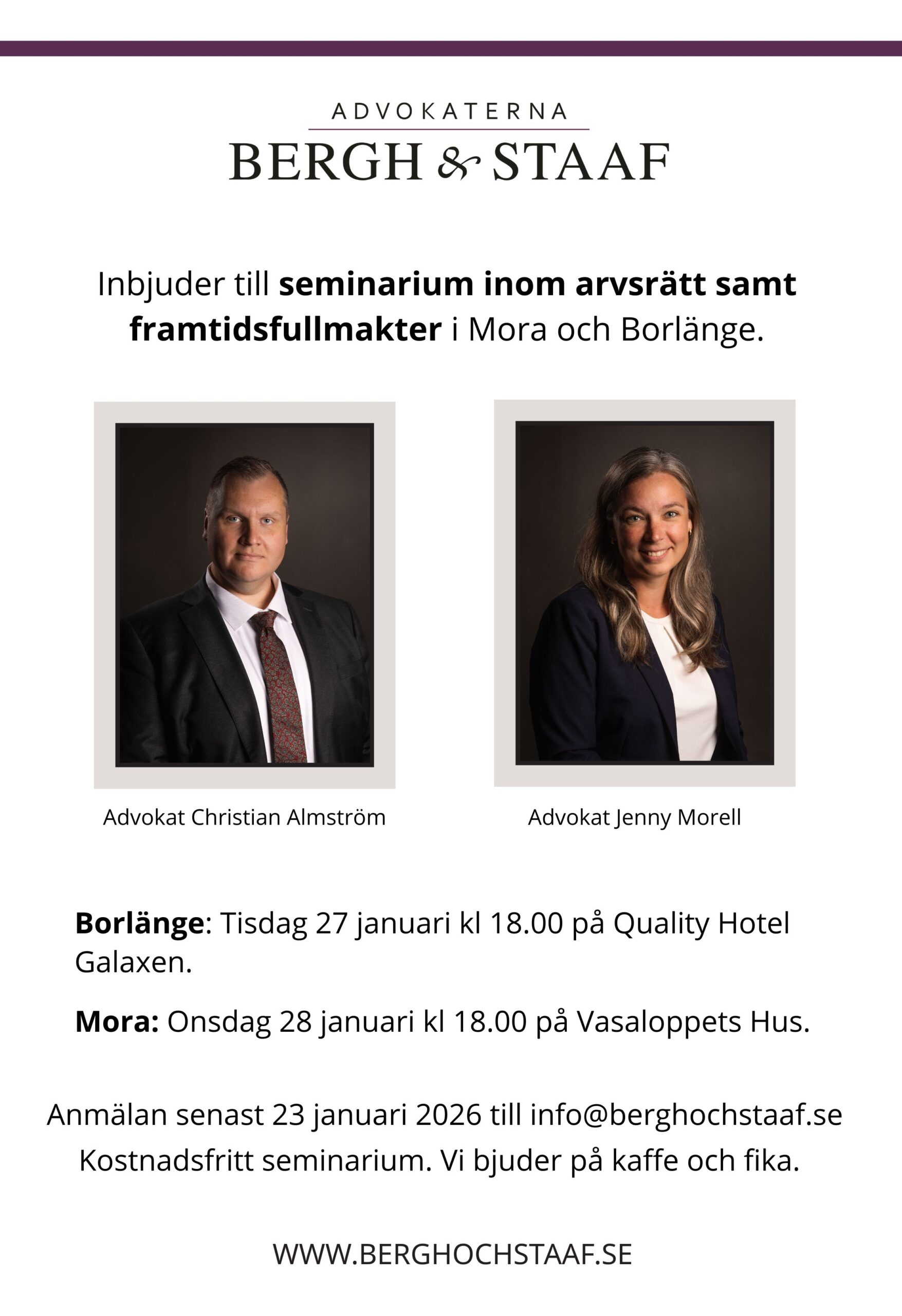 Advokatfirman bedriver verksamhet huvudsakligen i Dalarna, Värmland, Hälsingland och Stockholm. Firman är allmänpraktiserande med särskild kompetens inom affärsjuridik, arvsrätt, familjerätt, brottmål och trafikskador.